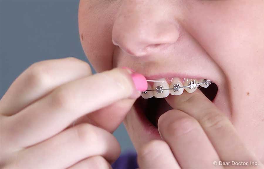To keep your teeth and gums clean and healthy, you need to floss at least once per day. But how do you get floss under the archwire of your braces? It's not so hard with the help of a floss threader. Using this device is somewhat like threading a needle: You pull one end of floss through the threader, and then push the threader — carrying with it the free end of the floss — under the archwire. Now grasp the floss on each end and slide it up and down the sides of both teeth, and all the way under the gums until you hear a squeaky sound. Finally, pull it out and use a new section of floss for the next area.